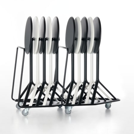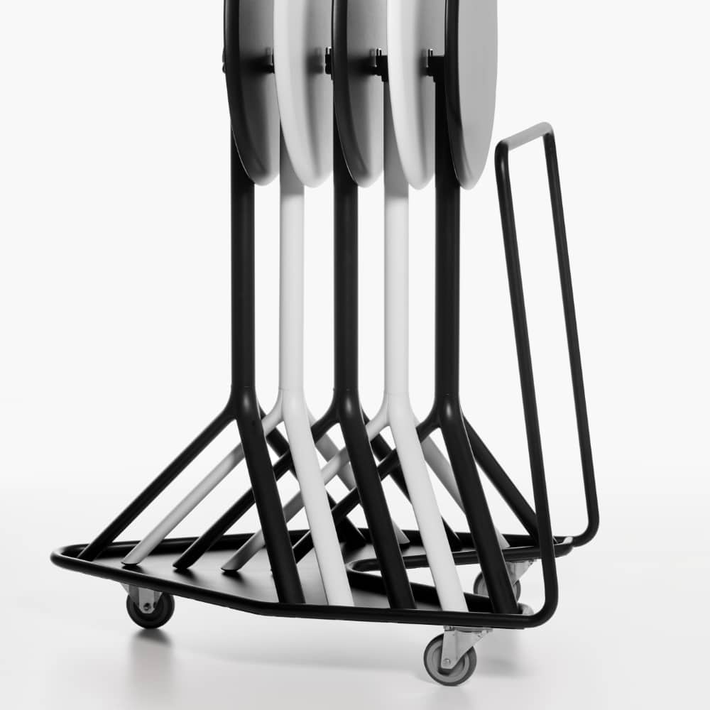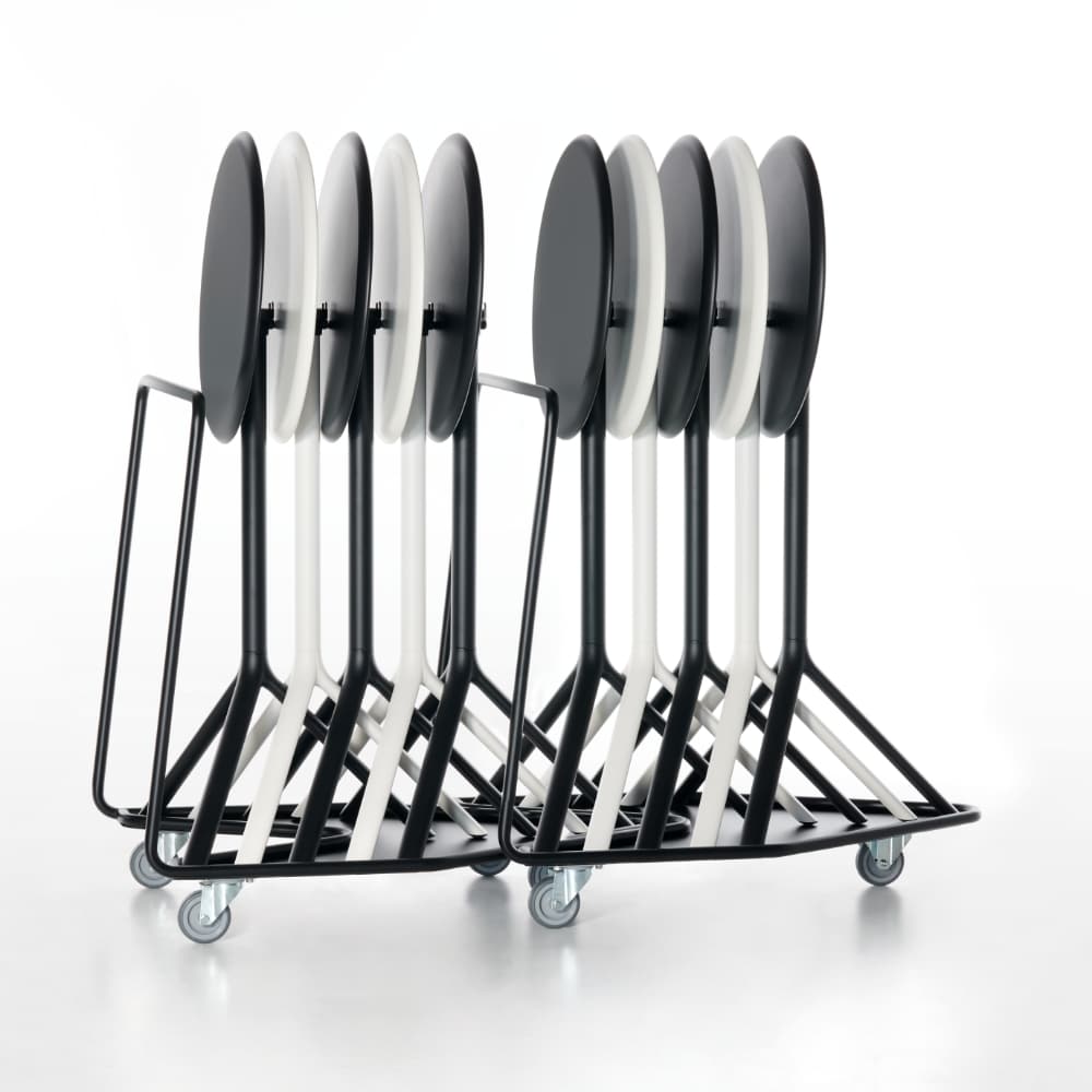 Der MIURA Table Trolley eignet sich optimal für den Einsatz in Eventlocations, Messehallen, Tagungsbereichen, Gastronomie und Objektflächen. Dort, wo Rundtische regelmäßig transportiert oder zwischenlagert werden müssen, sorgt der Wagen für eine komfortable und materialschonende Lösung.