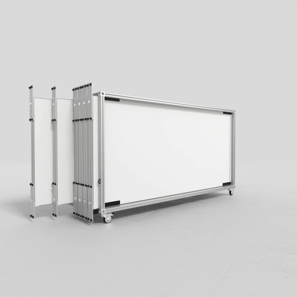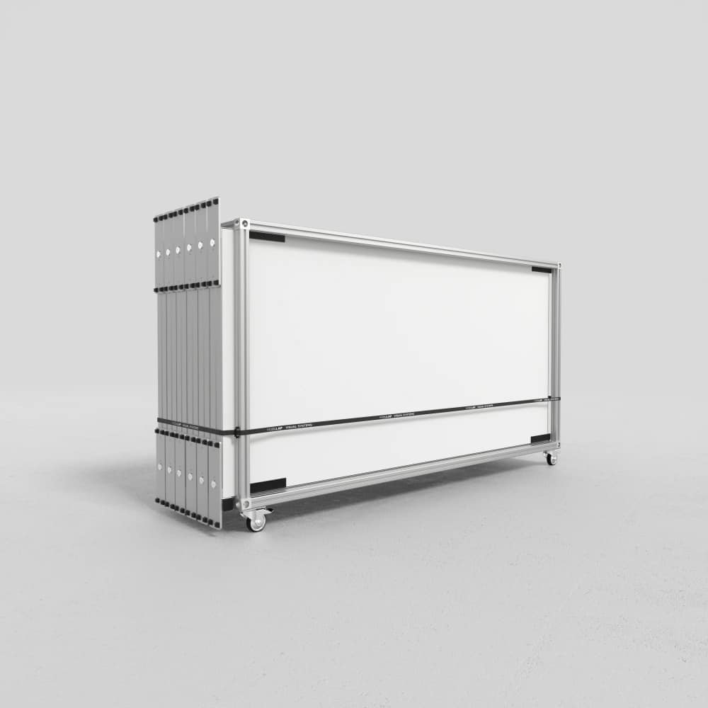 Dank der integrierten Rollen lassen sich die Transportwagen auch über längere Wege komfortabel bewegen. Ein Spanngurt hält die Elemente sicher in Position und sorgt dafür, dass Ihre Systemkomponenten während Transport und Lagerung geschützt bleiben. Das macht den MODULAP Transportwagen zur idealen Wahl für Unternehmen mit regelmäßigen Messe-, Event- oder Promotioneinsätzen.
